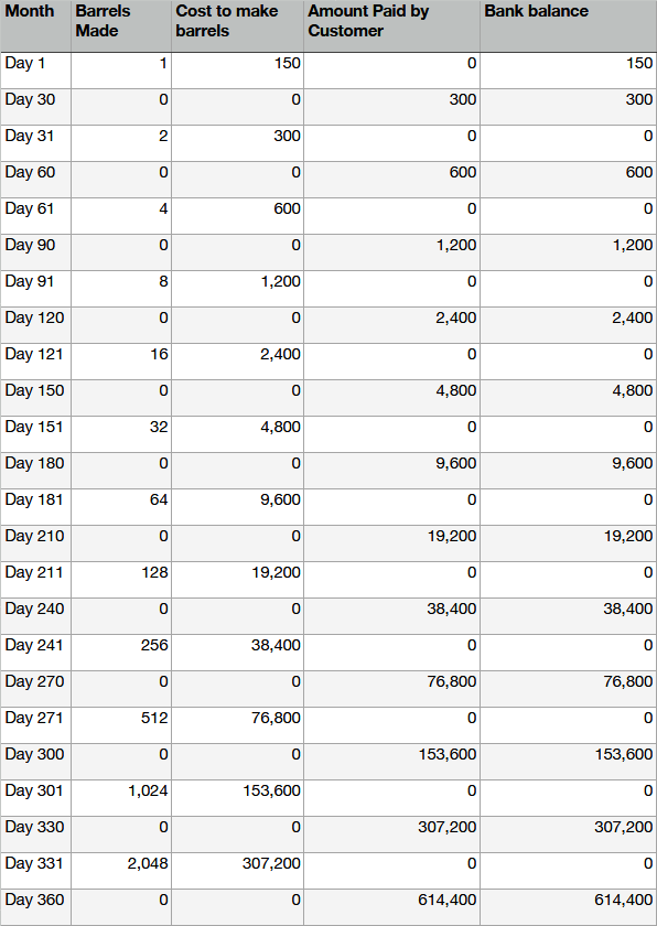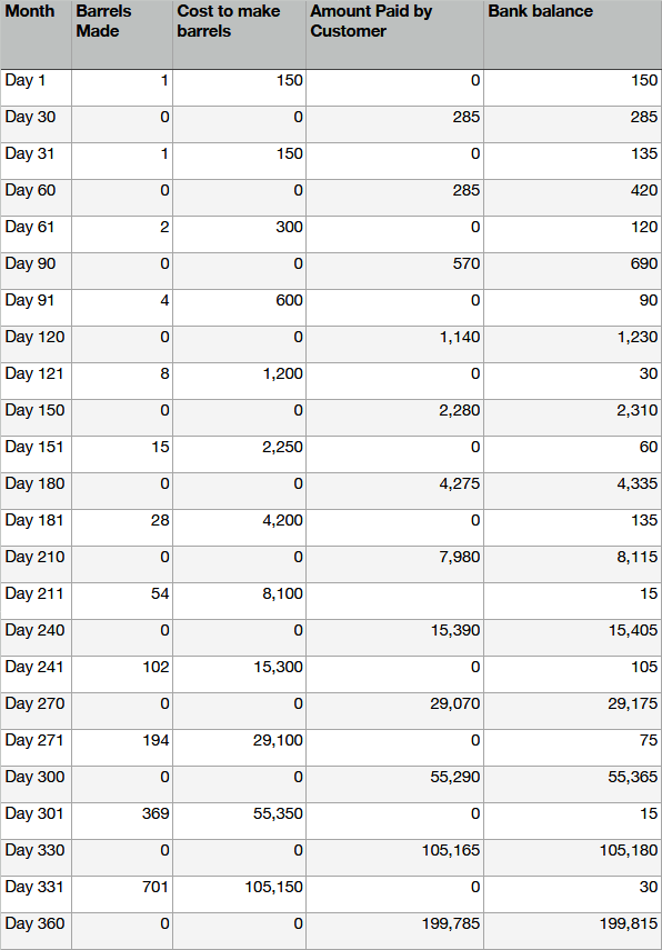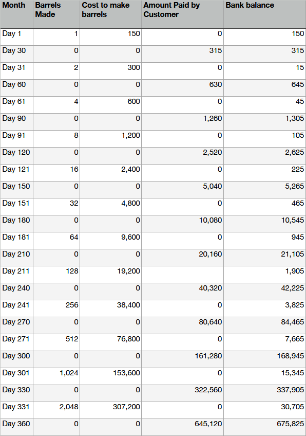 Reducing your price by 5% meant that on Day 151 you stopped being able to double production and had to reduce the production by 2 barrels, then the slow down just kept multiplying. 30 days later you, once again, couldn’t double your production and had to reduce it by another 6 barrels. A month later you had to reduce it by 10, then by 19 and finally by 37.